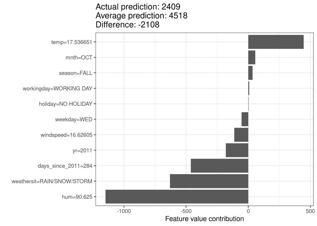 ภาพด้านบนแสดง Shapley value ของวันที่ 285 ซึ่งให้ทำนายว่ารถจักรยาน 2,409 คันจะถูกเช่า คิดเป็นจำนวนน้อยกว่าค่าเฉลี่ย (4,518 คัน) อยู่ 2,108 คัน โดยจะเห็นได้ว่าสภาพอากาศที่มีฝน, หิมะ, พายุ และความชื้นในอากาศ มีผลกระทบในเชิงลบมากที่สุด ในขณะที่อุณหภูมิเป็นผลกระทบเชิงบวกกับจำนวนรถจักรยานที่ถูกเช่า ผลรวมของ Shapley value ของทุกฟีเจอร์จะเท่ากับผลต่างระหว่างค่าทำนายกับค่าเฉลี่ยของการทำนาย (-2,108) เช่นเดียวกรณีอื่นที่ใช้ Shapley value ในการอธิบายโมเดล