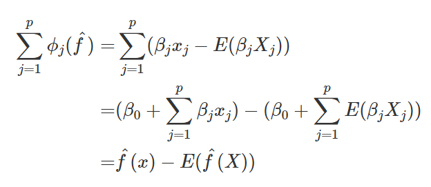 ซึ่งคือผลต่างของส่วนค่าทำนายที่ได้จากฟีเจอร์นั้น (ค่าฟีเจอร์นั้นคูณด้วยน้ำหนัก) กับค่าเฉลี่ยของส่วนค่าทำนายที่ได้จากฟีเจอร์นั้นครับ นอกจากนี้ถ้าหากนำค่าผลกระทบจากทุกฟีเจอร์มารวมกัน จะได้ว่ามีค่าเท่ากับผลต่างของค่าทำนายจุดนั้นกับค่าเฉลี่ยการทำนายของโมเดลพอดี ดังสมการ