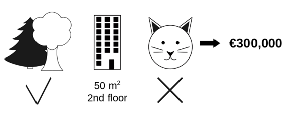 สมมุติว่าท่านได้ฝึกโมเดล machine learning เพื่อทำนายราคาห้องพักของคอนโด เมื่อใช้โมเดลดังกล่าว ทำนายราคาห้องขนาดพื้นที่ 50 m2 อยู่ชั้น 2 มีสวนอยู่ใกล้เคียง พบว่ามีราคาทำนายอยู่ที่ €300,000 (3 แสนยูโร หรือ ประมาณ 11.5 ล้านบาท) และท่านต้องการทราบว่าแต่ละฟีเจอร์ส่งผลอย่างไรต่อการทำนายดังกล่าวนี้: