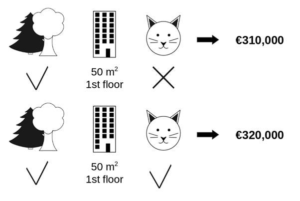 - นำค่าฟีเจอร์ที่ต้องการพิจารณาผลกระทบ คือ “ห้ามเลี้ยงสัตว์” เข้าสู่กลุ่มย่อยของค่าฟีเจอร์ดังกล่าวและทำการพิจารณา พบว่าราคาทำนายอยู่ที่ 310,000 ยูโร