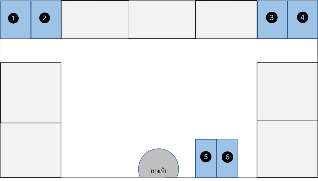 เราต้องการทราบจำนวนเตียงและจำนวนรถเข็นของแต่ละที่เพื่อให้มีเตียงและรถเข็นให้เพียงพอต่อการใช้บริการ เริ่มขั้นแรกด้วยการวาดแปลนง่ายๆ โดยมีห้องเก็บของทั้งหมด 4 ห้องในตำแหน่งหมายเลข 1, 2, 3 และ 4 และจุดบริการเตียงและรถเข็น 2 จุด ณ ตำแหน่งหมายเลข 5 และ 6 ดังรูปที่ 1