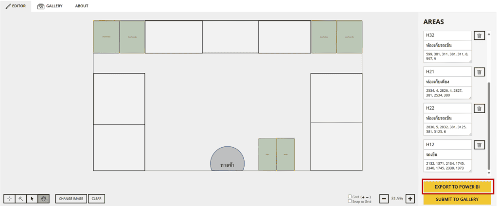 จากนั้นนำรูปเข้า Synoptic Designer ซึ่งเป็นเครื่องมือที่จะช่วยกำหนดขอบเขตของห้องแต่ละห้อง เมื่อนำเข้าแล้วเราก็จะสามารถนำรูปที่เราวาดไว้เข้ามาแสดงในแดชบอร์ดได้ โดยกำหนด Area name ให้ครบทุกห้อง เมื่อกำหนดเสร็จแล้ว กด Export to Power BI ไฟล์ที่ได้เป็นประเภทไฟล์นามสกุล svg