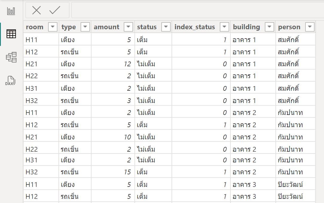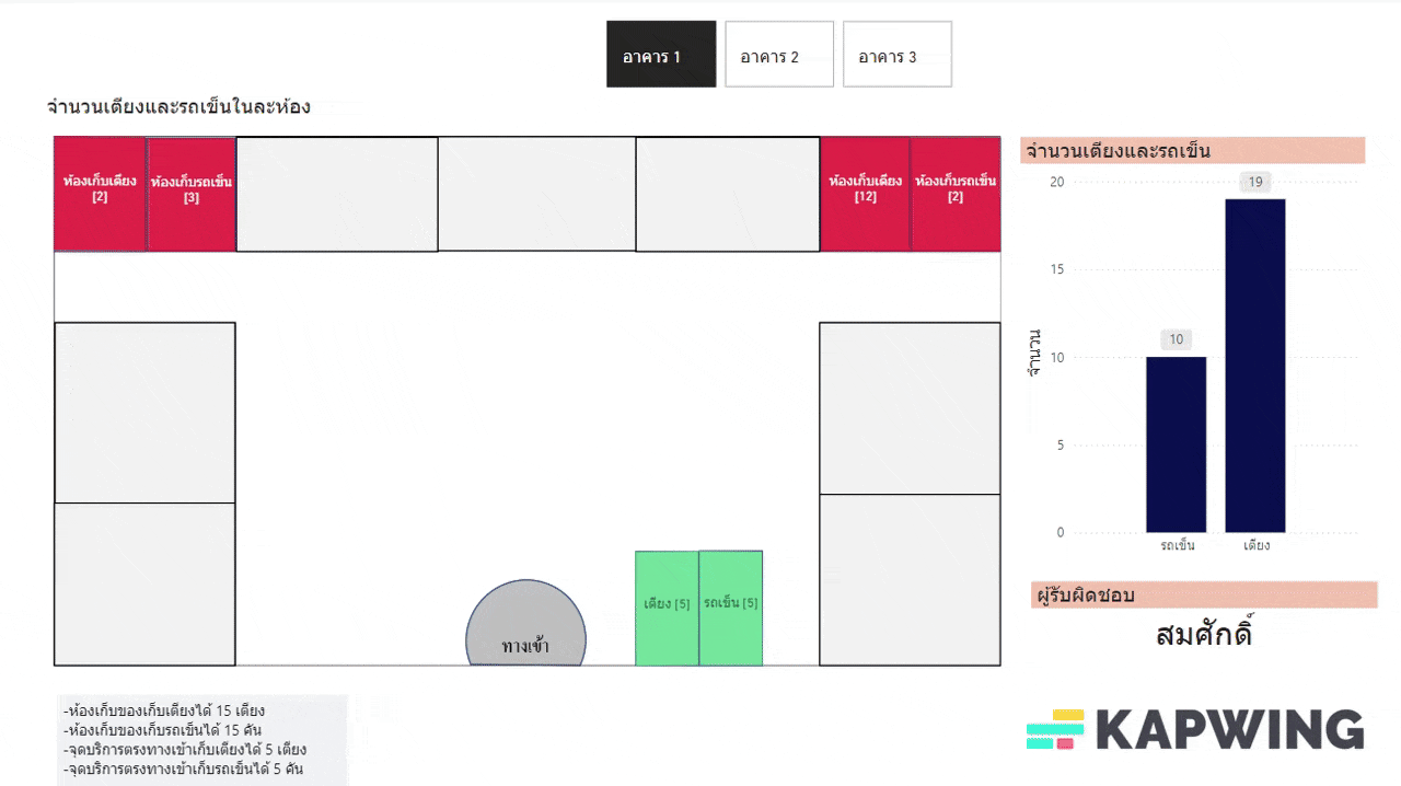 เพิ่ม Visual อื่นๆ เช่น Slicer เพื่อเลือกอาคารที่สนใจ เพิ่มการแสดงจำนวนเตียงและรถเข็นรวมในแต่ละอาคาร และแสดงชื่อผู้รับผิดชอบที่มีหน้าที่ดูแล จุดบริการเตียงและรถเข็น