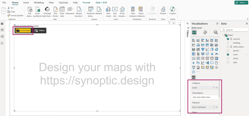 เมื่อนำเข้า Visual แล้ว หลังจากนั้นให้ลากและวางฟิลด์ในช่องที่กำหนด ในส่วนของ Visual เลือก Local maps จากนั้นเลือกรูปที่สร้างไว้ โดยเป็นไฟล์นามสกุล .svg
