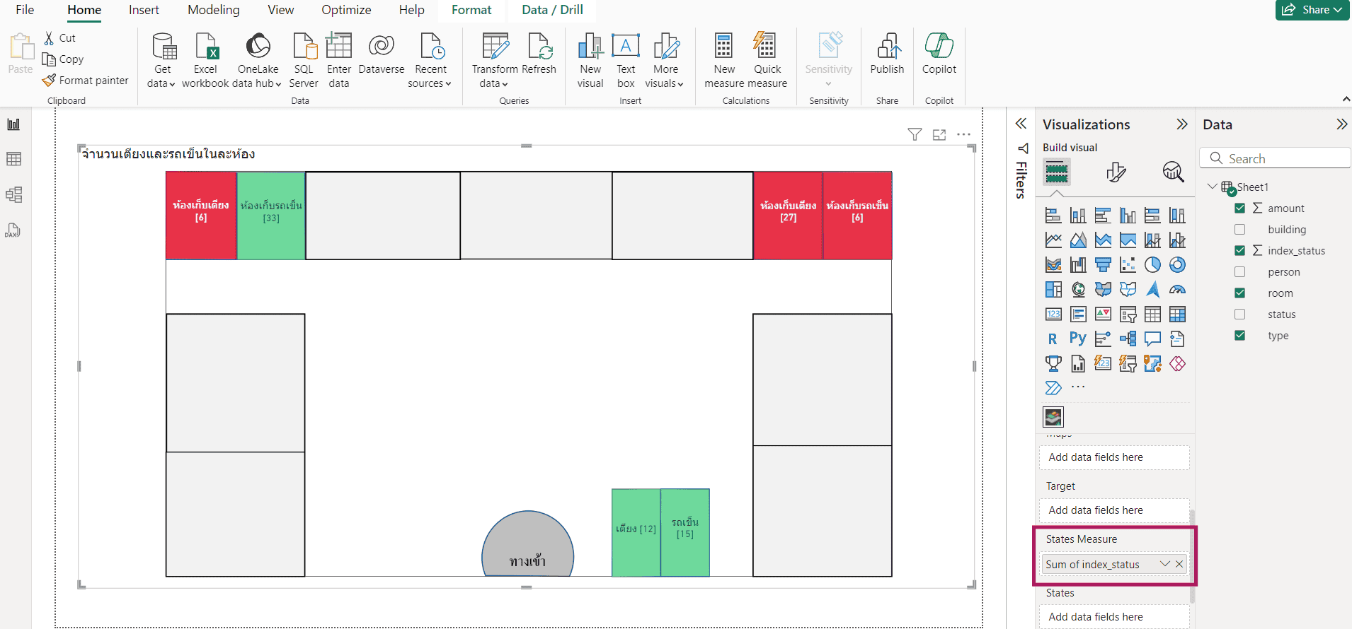 เมื่อนำเข้าไฟล์ที่ต้องการแล้ว หลังจากนั้นนำฟิลด์ index_Status มาใส่ใน States Measure เพื่อใช้ในการกำหนดสีของสถานะของจำนวนรถเข็นและเตียง