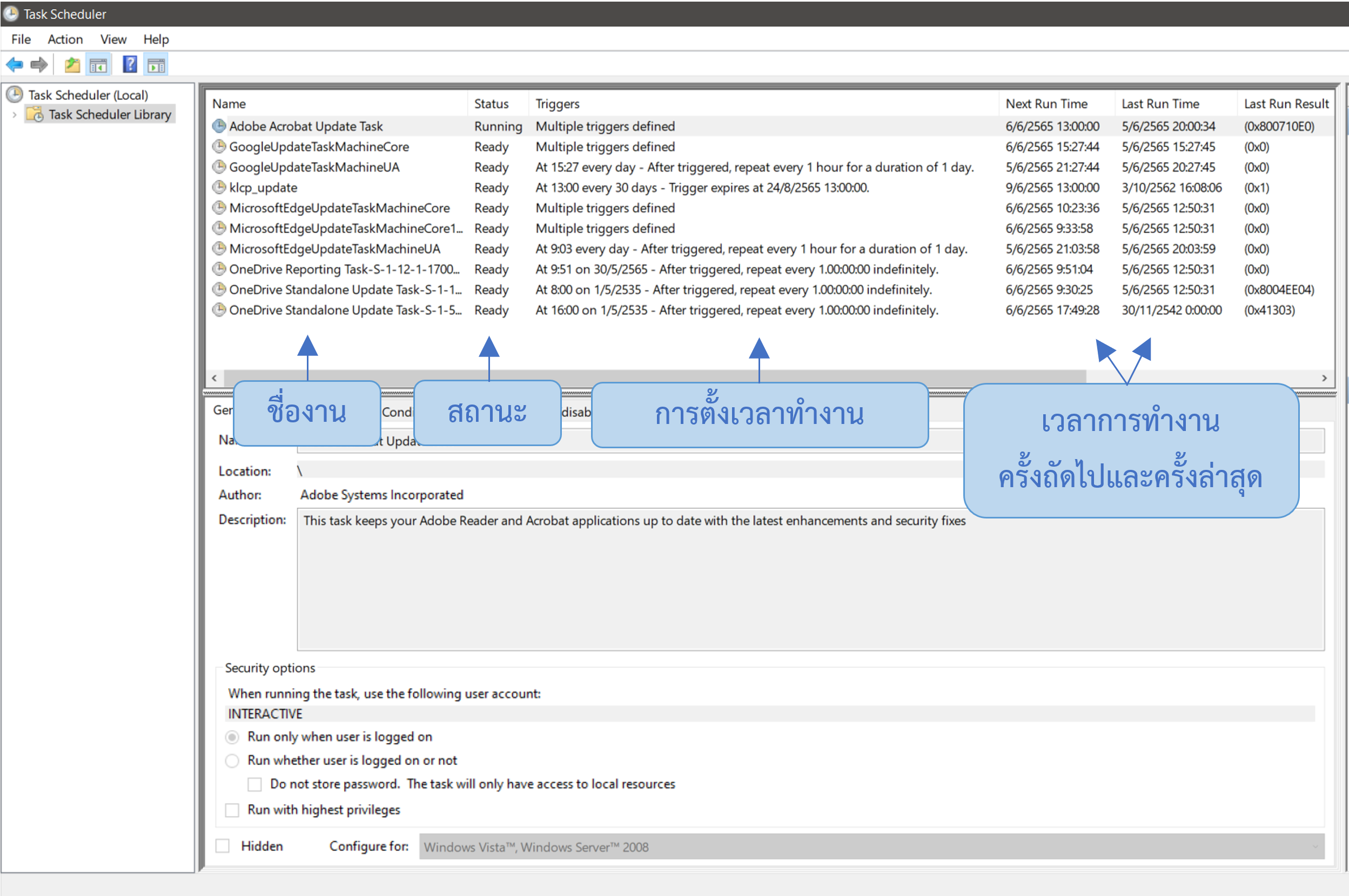 เมื่อเข้ามาภายในตัวโปรแกรม หากไปที่ Task Scheduler Library จะพบกับงานต่าง ๆ ที่ถูกกำหนดเวลาการทำงานไว้ พร้อมทั้งสถานะ เวลาการทำงานครั้งล่าสุด และเวลาการทำงานครั้งถัดไป ดังเช่นตัวอย่างในรูปด้านล่าง