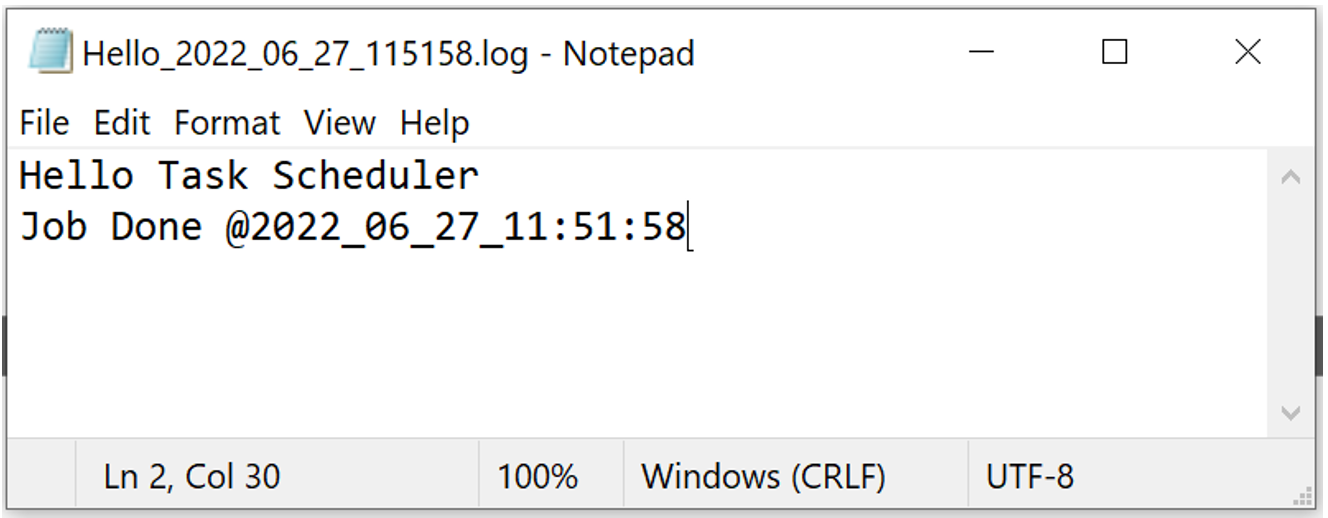 ลงไปในไฟล์ที่ชื่อว่า Hello_YYYY_MM_DD_hhmmss.log ภายในโฟลเดอร์ D:task_scheduler โดยที่ YYYYMMDDhhmmss แทน ปีเดือนวันชั่วโมงนาทีและวินาทีที่คำสั่งทำงาน