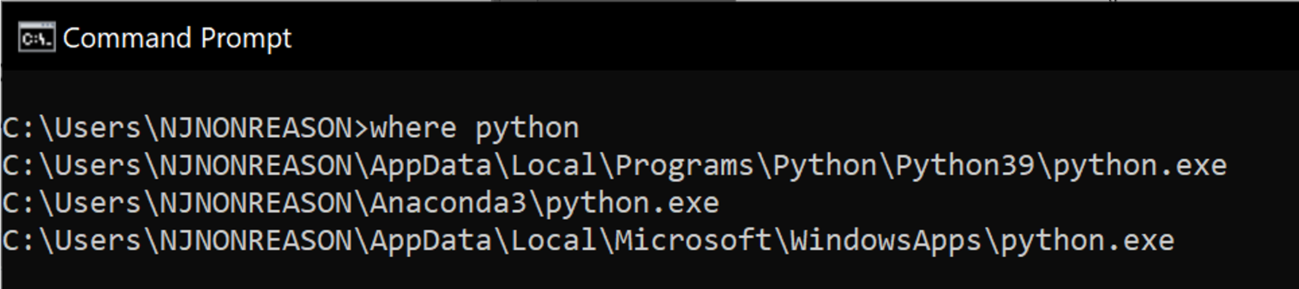 โดยปกติแล้ว python.exe จะอยู่ใน location ดังเช่นในรูปด้านล่าง หรือสามารถทำการค้นหาโดยพิมพ์คำสั่ง where python ภายใน Command Prompt