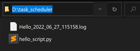เราสามารถดู location ไปยังโฟล์เดอร์ที่จัดเก็บ Python Script ได้จาก Address Bar ของ File Explorer ดังเช่นในรูปด้านล่าง เพื่อนำมาประกอบกับชื่อไฟล์เป็น Path ไปยัง Python Script เช่นกรณีนี้จะเป็น “D:task_schedulerhello_script.py”