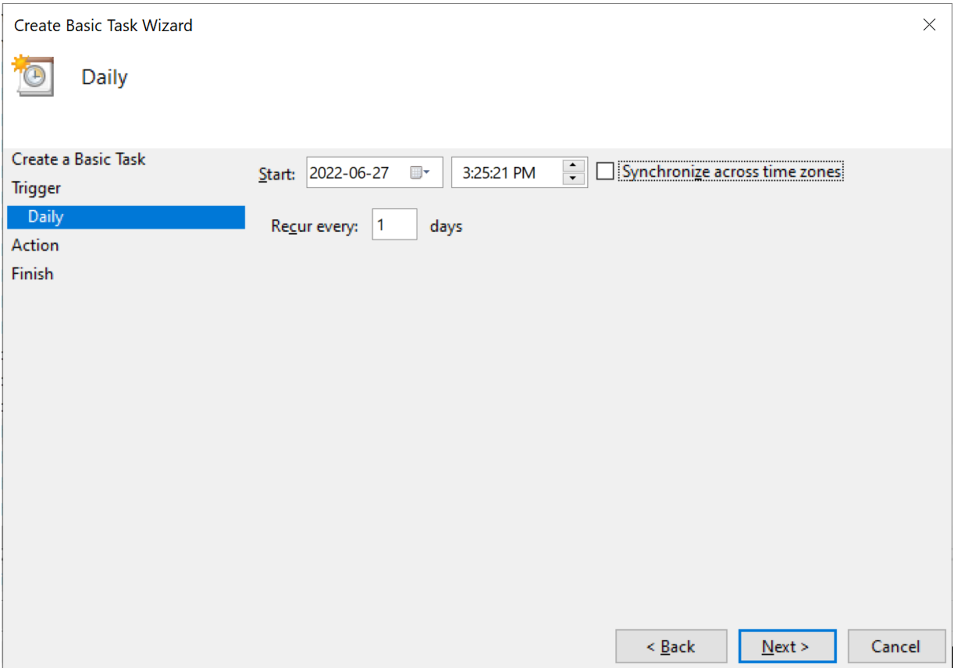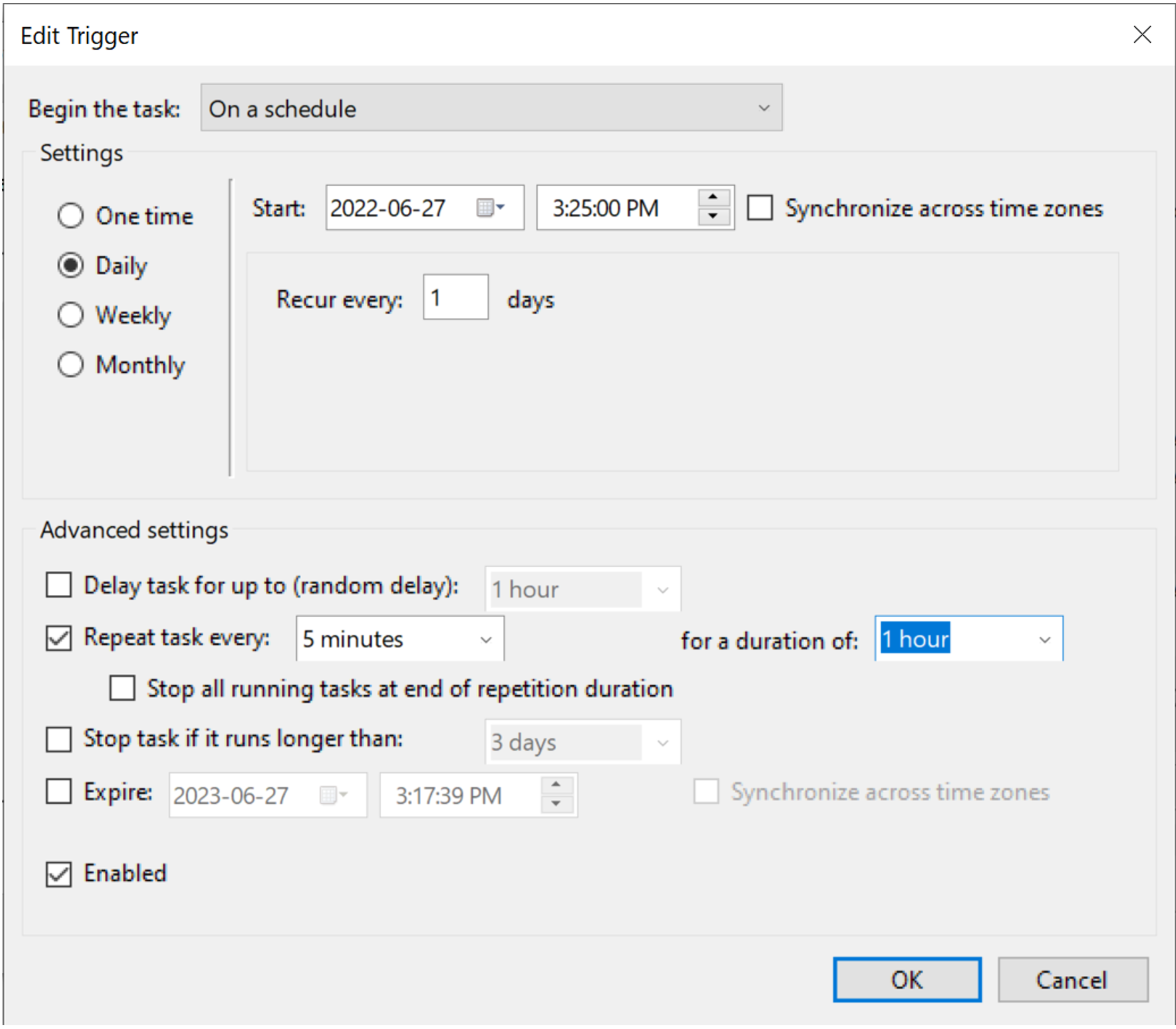 เช่น ในตัวอย่างด้านล่างเป็นการกำหนดรูปแบบการทำงาน ให้เริ่มต้นวันที่ 27 มิถุนายน 2022 เวลา 3:25:00 โดยจะสั่งการทำงานทุก ๆ 5 นาที เป็นเวลา 1 ชั่วโมง