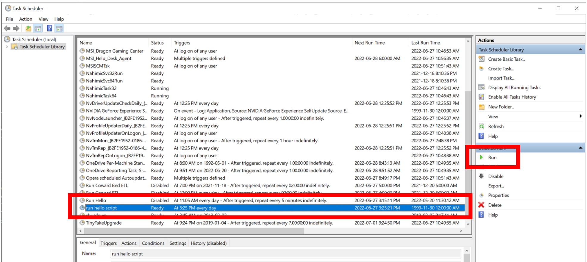 เมื่อเราทำการสร้าง Task ของเราเป็นที่เรียบร้อยแล้ว เราอาจอยากทดสอบว่า Task ที่สร้างขึ้นนี้จะสามารถทำงานได้จริงเมื่อถึงเวลาที่กำหนด เราสามารถสั่งการทำงานของ Task นอกเหนือจากเวลาที่ตั้งไว้ได้โดยเลือก Task ที่ต้องการและกดปุ่ม Run