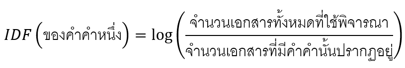 | คำ | จำนวนเอกสารที่ปรากฏ | Inverse Document Frequency (IDF) |