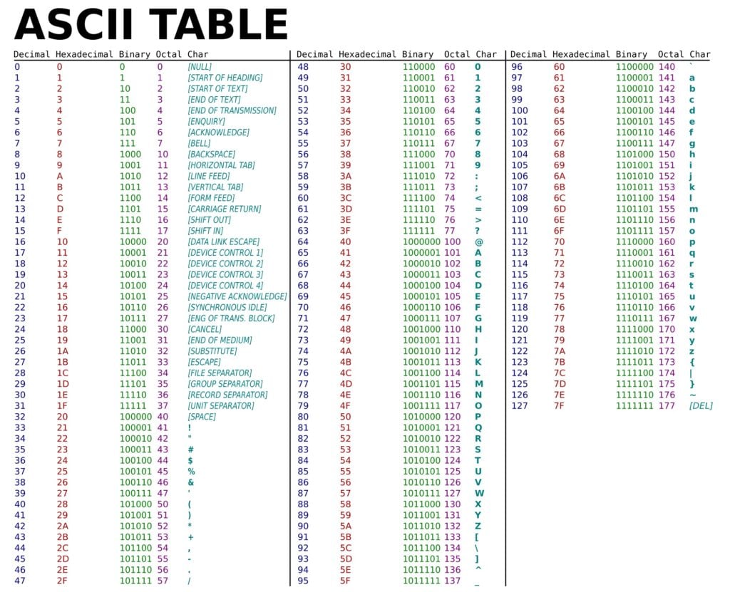 ตัวอย่างเช่น ในรูปที่ 1 นั้น ตัวอักษร “k” สามารถถูกจัดเก็บในคอมพิวเตอร์ได้ ด้วยการเข้ารหัสเป็น “1101011” (ตัวเลขฐานสอง หรือ binary) หรือ “6B” (ตัวเลขฐานสิบหก หรือ hexadecimal) จัดเป็นอักขระตัวที่ 107 ใน 128 ตัว (นับในเลขฐานสิบ และเริ่มนับตัวแรกจากศูนย์ตาม indexing convention ของระบบคอมพิวเตอร์)