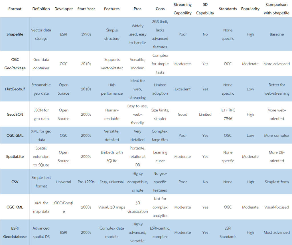 จากตาราง ได้เปรียบเทียบทั้งคุณสมบัติ, ข้อดี, ข้อเสีย และความสามารถของรูปแบบข้อมูลทางภูมิศาสตร์ต่าง ๆ ที่สามารถใช้แทน Shapefile ได้ แต่ละรูปแบบมีลักษณะเฉพาะที่ทำให้เหมาะสมกับการใช้งานและความต้องการที่แตกต่างกัน การเลือกรูปแบบข้อมูลที่เหมาะสมจะช่วยเพิ่มประสิทธิภาพ และความสามารถในการจัดการข้อมูลทางภูมิศาสตร์
