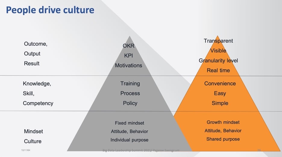 - เน้นการปรับกรอบความคิด (mindset) เพื่อขับเคลื่อนประสิทธิผลขององค์กร (business outcome) หลาย ๆ องค์กรอาจจะใช้การตั้ง KPI เพื่อผลักดัน (หรือบังคับ) ให้เกิดการเปลี่ยนแปลง ประกอบกับการลงทุนด้านการสร้างทักษะและองค์ความรู้มหาศาล แต่กลับไม่ได้ให้ความสำคัญกับการเปลี่ยนกรอบความคิด (mindset) ที่จะสร้างความเปลี่ยนแปลงได้จากภายในตัวพนักงานเอง คุณปาจรีย์ได้นำเสนอว่ากระบวนการดังกล่าวควรจะกลับกัน กล่าวคือ ให้การปลูกฝังค่านิยมและกรอบความคิดจากภายในตัวพนักงาน ขับเคลื่อนสู่การขวนขวายหาความรู้และพัฒนาบุคลากรรายบุคคลเอง สู่ประสิทธิผลที่มองเห็นได้จากภายนอก