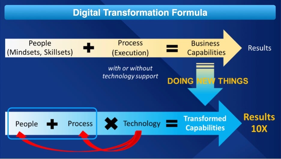 ถึงแม้ว่ากระบวนการทำ Digital Transformation จะไม่ได้มีสูตรสำเร็จตายตัว แต่องค์ประกอบที่ชัดเจนที่คุณปาจรีย์ได้แนะนำไว้ โดยอ้างถึงแนวคิดจาก Gartner คือ การปลูกฝังค่านิยมและชุดความคิด (mindset) ผนวกกับกระบวนการทำงาน (process) ที่พร้อมรับความเปลี่ยนแปลงอยู่เสมอ เมื่อถูกขยายผลด้วยเทคโนโลยี (technology) ที่ตอบโจทย์และภารกิจขององค์กร จะนำไปสู่ขีดความสามารถ (capabilities) ใหม่ ๆ ที่สร้างประสิทธิผลเชิงประจักษ์