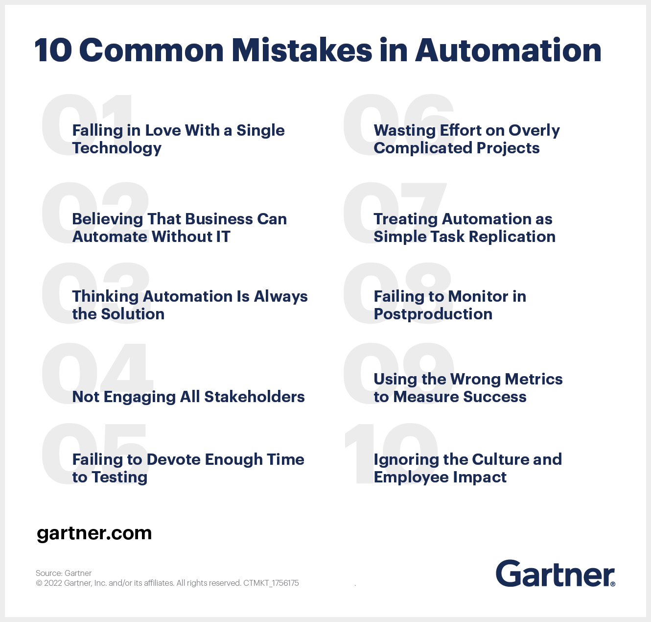 การนำระบบอัตโนมัติมาใช้ในองค์กรนั้นรับรองได้ว่าจะสามารถช่วยปรับปรุงต้นทุน คุณภาพ และความเร็วได้อย่างมีนัยสำคัญ แต่ข้อดีต่าง ๆ เหล่านี้ จำเป็นต้องมีแผนปฏิบัติการในส่วนของผู้บริหาร และหัวหน้าด้าน IT ที่คอยรับผิดชอบต่อข้อผิดพลาดทั่วไปที่อาจเกิดขึ้น โดยเฉพาะอย่างยิ่ง ในกรณีที่มีการใช้งานระบบอัตโนมัติเพิ่มขึ้น และฝ่าย IT ต้องรับหน้าที่บริหารจัดการความคิดริเริ่มด้านระบบอัตโนมัติพร้อมกันหลายระบบ