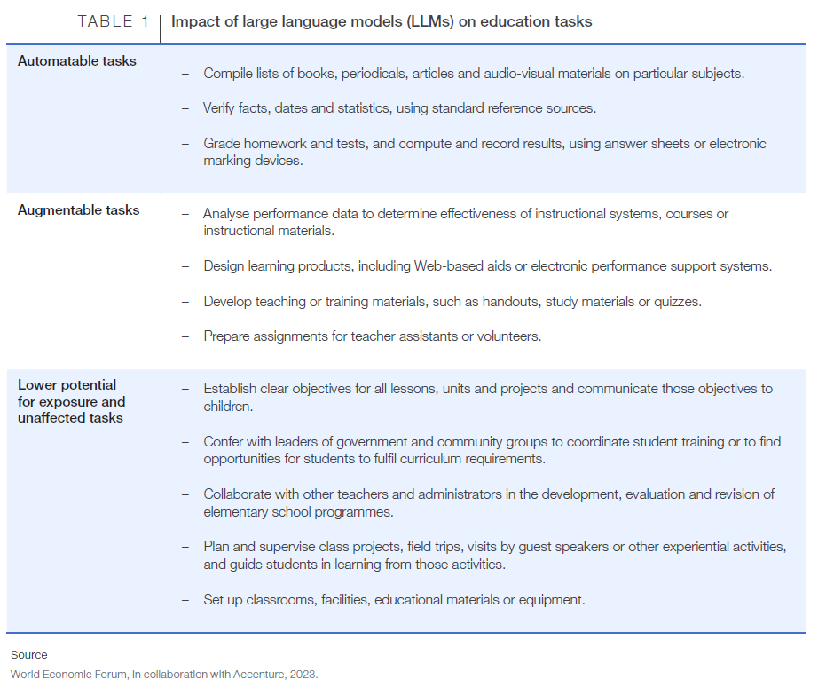 จากงานวิจัยของ WEF ซึ่งจัดทำขึ้นโดยร่วมมือกับ Accenture พบว่า 40% ของภาระงานอาจารย์ทั้งหมดที่ใช้ไปกับงานบริหาร โดยจากการสำรวจพบว่าภาระงาน เช่น การวางแผนการสอนหรือประเมินนักเรียนมีสัดส่วนอยู่ที่ 8%-20% ของภาระงานทั้งหมด ซึ่งงานอัตโนมัติหรืองานทำซ้ำเหล่านี้ สามารถนำโมเดลภาษาขนาดใหญ่ (LLM) เข้ามาใช้งานแทนได้ เช่น การใช้โมเดลภาษาขนาดใหญ่ในการรวบรวมรายชื่อหนังสือ วารสาร บทความ และสื่อโสตทัศน์ในหัวข้อที่เฉพาะเจาะจง และช่วยออกแบบการเรียนการสอน มุ่งเน้นไปที่งานสร้างสรรค์ หรือใช้เวลาร่วมกับนักเรียนได้มากยิ่งขึ้น