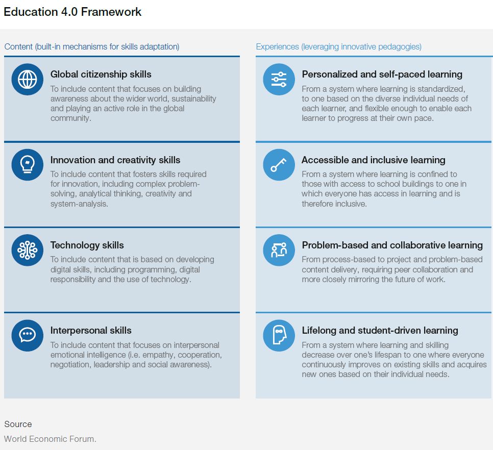 การศึกษา 4.0 เป็นกรอบการทำงานที่ครอบคลุมถึงการเปลี่ยนแปลงที่สำคัญและจำเป็นต่อการศึกษาในวัยเด็ก ส่งเสริมให้ได้ผลลัพธ์ทางการศึกษาที่ดีขึ้นอันเป็นพื้นฐานสำคัญต่อความต้องการของแรงงานในอนาคตตามรายงาน World Economic Forum’s Future of Jobs Report 2023 [1]