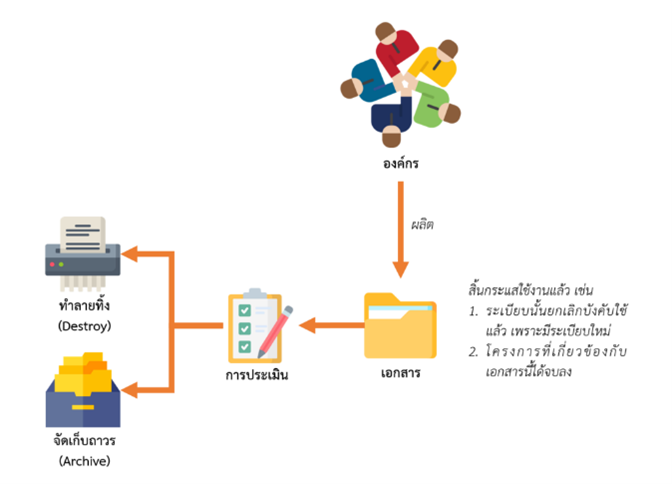 - Archives ในมุมมองของ Archival Material หรือ “เอกสารจดหมายเหตุ” หมายถึง เอกสารซึ่งเกิดจากการปฏิบัติงานของบุคคลหรือนิติบุคคลโดยเอกสารเหล่านั้นได้สิ้นกระแสการใช้งานแล้ว และได้รับการประเมินว่ามีคุณค่าอย่างต่อเนื่องต่อผู้ครอบครอง2 ซึ่งกระบวนการที่เกิดขึ้นสามารถตีความได้ตามภาพที่ 2