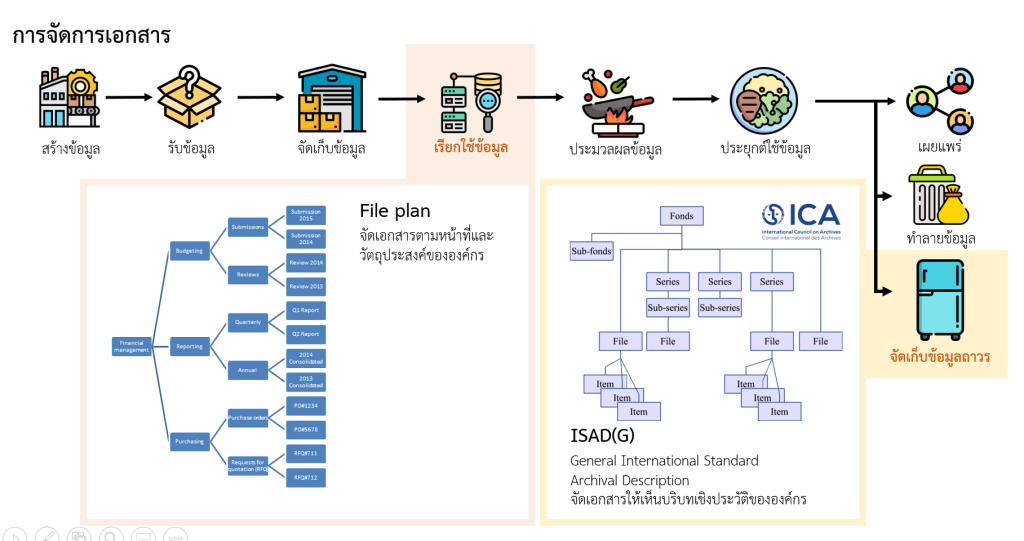 ซึ่งหลักการในการจัดการเอกสารบันทึกนั้นจะเน้นการใช้งานที่ทำให้องค์กร11 สะดวกในการทำงานตามภารกิจขององค์กรที่สุด โดยจะเริ่มแบ่งขั้นตอนตามหน้าที่ขององค์กร แล้วลงมาที่กิจกรรมซึ่งทำให้วัตถุบรรลุวัตถุจุดประสงค์นั้น โครงการ และชิ้นงานเอกสารตามลำดับ12 แต่หากพูดถึงมาตรฐาน ISAD(G)13 ซึ่งเป็นมาตรฐานในการจัดการเอกสารจดหมายเหตุหรือการจัดเก็บข้อมูลถาวร โจทย์ประธานของมาตรฐานนี้จึงเป็นวัตถุประสงค์ในการสืบสาวความเป็นมาและเหตุในการกระทำเชิงประวัติ การจัดมาตรฐานจึงจำเป็นต้องแบ่งตามหัวข้อที่ชี้ให้เห็นถึงเหตุการณ์สำคัญขององค์กร