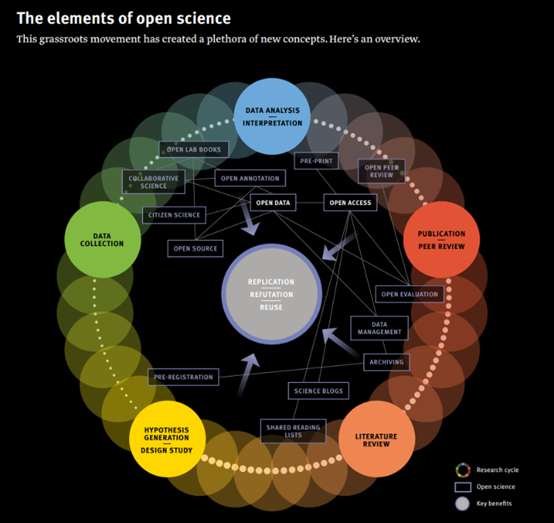 นับตั้งแต่ พ.ศ. 2550 (ค.ศ. 2007) เป็นต้นมา แนวคิดวิทยาการเปิดเผย (Open Science) ได้ถูกนำมาพูดถึงและปฏิบัติใช้ในวงการวิจัยและแพร่กระจายไปยังวงการอื่น ๆ รวมถึงการทำข้อมูลเปิดเผยอีกด้วย2 ซึ่งโครงสร้างและความเชื่อมโยงของแนวคิดวิทยาการเปิดเผยเป็นไปตามภาพที่ 2 โดยแนวคิดแกนหลักของวิทยาการเปิดเผยจะมีวัตถุประสงค์เพื่อเพิ่มความโปร่งใสในกระบวนการวิจัย นับตั้งแต่กระบวนการทำวิจัย การบริหารจัดการงานวิจัย ไปจนถึงการบริหารข้อมูลที่มาจากงานวิจัย3