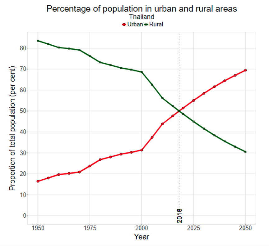การเติบโตในภาคอุตสาหกรรมทำให้ความเป็นเมืองมีการขยายตัวมากขึ้น และทำให้พื้นที่สีเขียวในเขตเมืองและชุมชน ถูกปรับเปลี่ยนแปลสภาพจากเดิมที่เคยเป็นพื้นที่ทางการเกษตร หรือพื้นที่ป่าธรรมชาติไปเป็นพื้นที่สำหรับที่อยู่อาศัย อาคารสำนักงาน ร้านค้า และโรงงานอุตสาหกรรมมากขึ้น ซึ่งองค์การสหประชาชาติ (United Nation) โดย Department of Economic and Social Affairs Population Dynamics ได้จัดทำรายงานการประเมินและการคาดการณ์จำนวนประชากรเมืองและชนบทของประเทศไทย นับแต่ปี ค.ศ. 1950 เป็นต้นมา โดยพบว่าจำนวนประชากรจากชนบทจะลดลงและเป็นประชากรในเมืองเพิ่มมากขึ้น โดยแสดงดังรูปที่ 1 ( Big Data เพื่อเพิ่มพื้นที่สีเขียว )