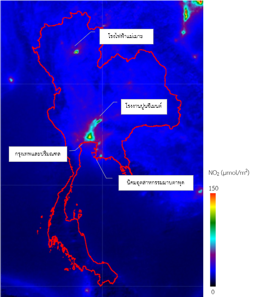 ผลการวิเคราะห์ระดับ NO2 เบื้องต้นจากข้อมูลภาพดาวเทียมในปี 2019 ของประเทศไทย พบว่าบริเวณที่มีความเข้มข้นของ NO2 สูงที่สุด จะอยู่ในเขตเมืองกรุงเทพและปริมณฑล รองลงมาจะเป็นบริเวณโรงงานปูนซีเมนต์ จังหวัดสระบุรี โรงไฟฟ้าแม่เมาะ จังหวัดลำปาง และนิคมอุตสาหกรรมมาบตาพุด จังหวัดระยอง ดังที่แสดงในรูปที่ 2