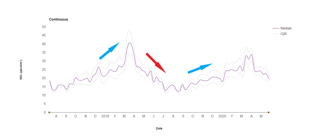 จากรูปที่ 4 ปริมาณ NO2 ในเขตเมืองกรุงเทพและปริมณฑลนั้น แน่นอนว่าสาเหตุหลักมาจากมลพิษจากการคมนาคมขนส่ง จากภาพจะเห็นได้ว่าปริมาณ NO2 มีแนวโน้มลดลงเรื่อย ๆ จากเดือนมกราคมอันเนื่องมากจาก การเดินทางกลับภูมิลำเนา และลดการเดินทางออกจากบ้านของประชาชน ภายหลังจากการประกาศใช้มาตรการให้ประชาชนเว้นระยะห่างทางสังคม