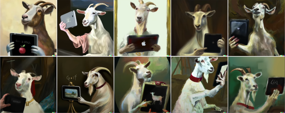 แพะถ่ายรูปด้วย iPad โดยรูปเป็นลักษณะภาพวาดพู่กันที่ได้รับแรงบันดาลใจจากรูปภาพโมนาลิซ่า