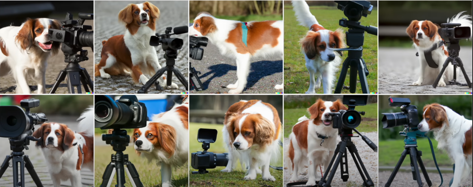 รูปที่ 1 แสดงรูปสุนัขแสนน่ารักข้างหลังกล้องถ่ายรูป แต่ดังที่เกริ่นไป…รูปเหล่านี้ไม่ได้เป็นรูปที่มีอยู่จริง แต่เป็นรูปที่ DALL·E รุ่นที่ได้รับการพัฒนาล่าสุดสร้างขึ้นมาจากคำบรรยายที่มนุษย์ป้อนเข้าไปในระบบอย่าง “A kooikerhondje using a camera on a movie set” หรือ “สุนัขสายพันธ์ Kooikerhondje ใช้กล้องถ่ายรูปในกองถ่ายภาพยนต์” ดูด้วยตาเปล่าแล้ว เราต่างต้องทึ่งกับความสมจริงของรูปภาพ แสงเงาและความละเอียดของภาพ แสดงให้เห็นถึงความก้าวหน้าของปัญญาประดิษฐ์ที่เข้าใจและเชื่อมโยงได้ว่า องค์ประกอบของรูปภาพอย่างสุนัขพันธ์ Kooikerhondje และกล้องถ่ายรูปที่สามารถเห็นได้ในกองถ่ายภาพยนต์มีลักษณะอย่างไร และยังสามารถนำองค์ประกอบเหล่านั้นมารวมกันได้อย่างแนบเนียนอีกด้วย