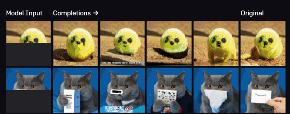 จากความสามารถของ GPT-3 ที่สามารถสร้างข้อความที่สอดคล้องกันได้ ในปีเดียวกัน ทางทีมงาน OpenAI ได้ต่อยอดในการใช้ระบบโครงข่ายประสาทเทียมนี้มาเติมรูปภาพที่ขาดหายไป กลายเป็นโมเดลที่มีชื่อว่า Image GPT (บทความวิจัยที่เกี่ยวข้องสามารถอ่านได้ที่ Generative Pretraining from Pixels by Mark Chen et.al. (2020)) พบว่า โมเดลนี้ยังทำงานได้ดีเลยทีเดียว ตามตัวอย่างที่แสดงต่อไปนี้