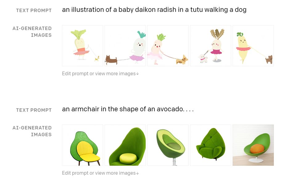 ความโดดเด่นของ DALL·E คือ สามารถสร้างรูปภาพตามคำบรรยายที่มนุษย์ป้อนเข้าไปในระบบได้โดยทันที แม้ว่าจะไม่เคยเห็นมาก่อนในช่วงการฝึกโมเดล และยังมีความเข้าใจในองค์ประกอบของรูปภาพต่าง ๆ เช่น สไตล์และเทคนิคการวาดภาพหรือความแตกต่างของกาลเวลา