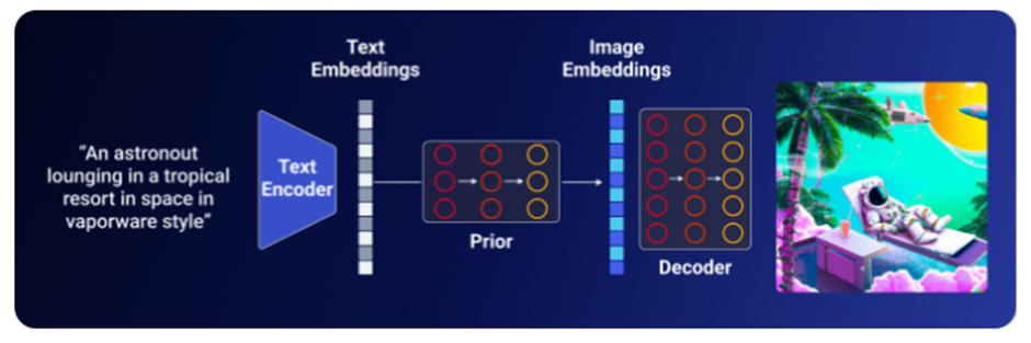 - Prior model ซึ่งเป็นโมเดลสำหรับการเก็บข้อมูลขององค์ประกอบหลักของภาพที่ต้องการสร้างจากคำบรรยายภาพ โมเดลนี้จะรับ CLIP Text Embedding ซึ่งเป็นเวกเตอร์ที่เก็บข้อมูลของคำบรรยายภาพที่แปลงไว้แล้วและ สร้าง CLIP Image Embedding ที่สอดคล้องกันออกมา