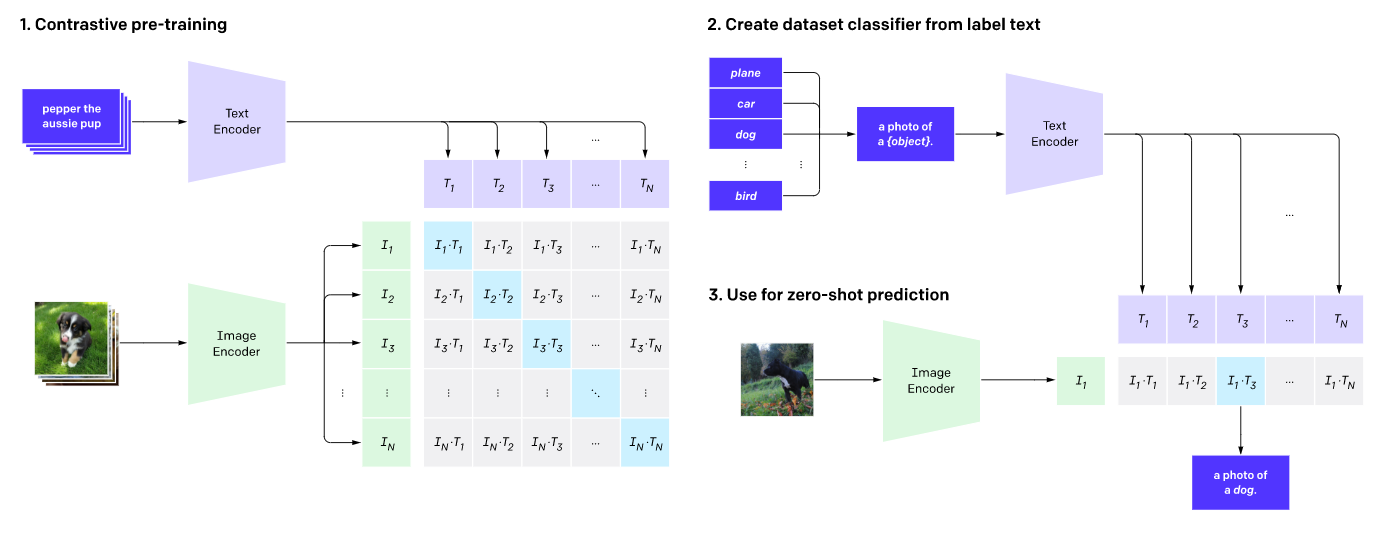 - CLIP (Contrastive Language-Image Pre-training) เป็นอีกหนึ่งผลงานของ OpenAI ซึ่งสร้างคำบรรยายภาพจากรูปภาพที่กำหนด (นั่นคือ ทำหน้าที่ตรงข้ามกับ DALL·E) โมเดลนี้ประกอบไปด้วยโครงข่ายประสาทเทียมสองตัว นั่นคือ Text Encoder และ Image Encoder ซึ่งเป็นตัวแปลงคำบรรยายและรูปภาพให้อยู่ในรูปแบบเวกเตอร์ที่เรียกว่า Text Embedding และ Image Embedding ตามลำดับ