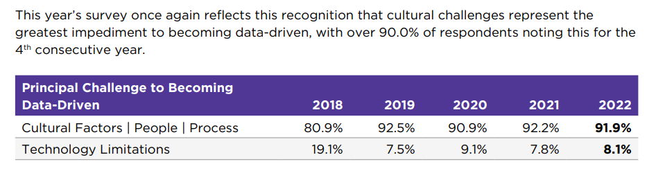ปัจจุบันความท้าทายขององค์กรในการกำหนดยุทธศาสตร์ด้านข้อมูลอาจจะไม่ใช่เรื่องของเทคโนโลยีอีกต่อไป จากรายงานผลการสำรวจประจำปีของ NewVantage Partners ซึ่งเป็นรายงานว่าด้วยการติดตามความคืบหน้าของการริเริ่มด้านข้อมูลในบริษัทต่าง ๆ พบว่าผู้บริหารระดับสูงด้านข้อมูลของหลาย ๆ บริษัทต่างลงความเห็นว่า วัฒนธรรมองค์กร เป็นปัจจัยหลักที่เป็นอุปสรรคในการขับเคลื่อนองค์กรด้วยข้อมูล สูงถึง 91.9% ส่วนอีก 8.1% คือปัจจัยเรื่องข้อจำกัดทางเทคโนโลยี นี่เป็นปัญหาที่เข้าใจและคาดการณ์ได้ เพราะการเปลี่ยนองค์กรเป็นองค์กรที่ขับเคลื่อนด้วยข้อมูลนั้น ว่าด้วยความสามารถในการปรับเปลี่ยนและเปลี่ยนแปลงของทั้งคนและองค์กรพร้อมกัน องค์กรที่ก่อตั้งมาเนิ่นนานและประสบความสำเร็จไม่สามารถเปลี่ยนแปลงได้รวดเร็วเหมือนบริษัทเล็ก ๆ ที่เพิ่งเริ่มสร้างตัว การปรับตัวใช้อินเทอร์เน็ตหรือเทคโนโลยีใหม่ ๆ ในบางองค์กรต้องใช้เวลานานกว่าทศวรรษจึงสำเร็จ การปรับตัวเรื่องการใช้ข้อมูลในองค์กรก็อาจใช้เวลานานไม่ต่างกัน