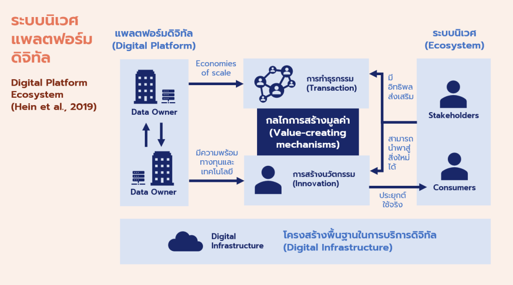 - ระบบนิเวศเดิม: ระบบประกอบด้วยผู้ที่มีส่วนเกี่ยวข้องกับแพลตฟอร์ม (Stakeholders) และผู้ใช้งานแพลตฟอร์ม โดยในส่วนนี้เป็นส่งเสริมให้เกิดกิจกรรมในแพลตฟอร์มดิจิทัล