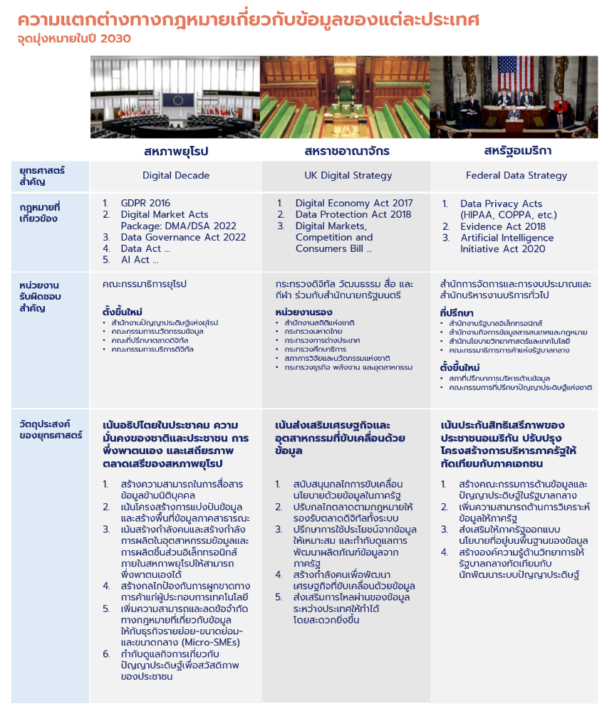 ทั้งสามกลุ่มประเทศได้กำหนดเป็นแผนยุทธศาสตร์เกี่ยวกับข้อมูลไว้อย่างชัดเจน ซึ่งในสาระสำคัญจะพบว่าแต่ละกลุ่มประเทศมีโจทย์ที่ต้องแก้ไขปัญหาไม่เหมือนกัน โดยในบริบทของสหภาพยุโรปและสหรัฐอเมริกาจะเน้นไปที่การปกป้องสิทธิเสรีภาพของประชาชนจากเทคโนโลยีดิจิทัลเป็นสำคัญ ขณะที่สหราชอาณาจักรจะเน้นไปที่การส่งเสริมและปรับเปลี่ยนโครงสร้างทางเศรษฐกิจให้มีความเป็นดิจิทัลทัดเทียมนานาประเทศ