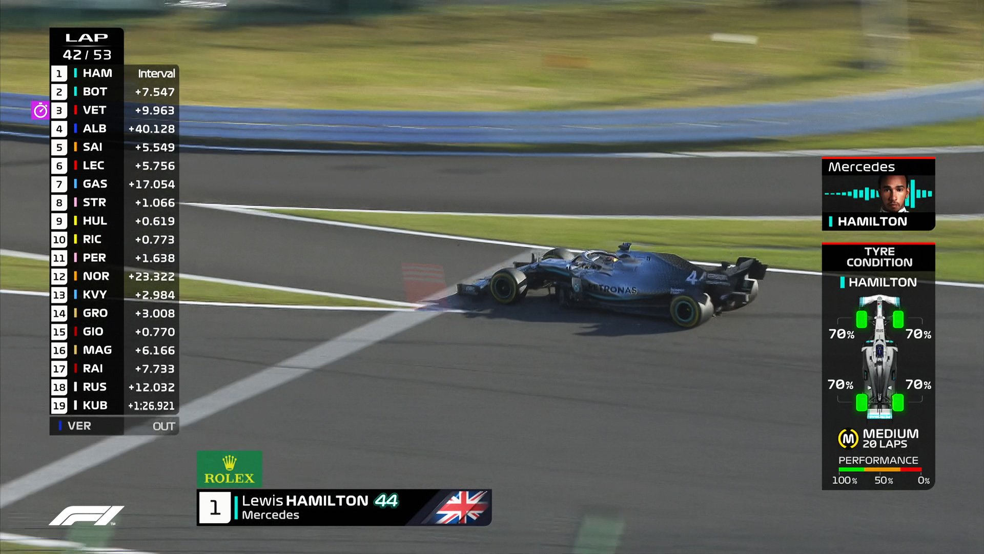 นอกเหนือจากทีมแข่ง F1 ที่ใช้ข้อมูลในการพัฒนาความเร็วในการแข่งขันแล้ว ทางผู้จัดการแข่งขัน F1 หรือ Federation Internationale de l’Automobile (FIA) ก็มีการใช้ข้อมูลเพื่อเพิ่มอรรถรสในการรับชมการแข่งขันให้กับแฟนกีฬาแห่งความเร็วอีกด้วย ผ่านการใช้ข้อมูลมาแสดงออกมาเป็นกราฟิกที่เข้าใจง่าย ทำให้ผู้ชมเข้าใจถึงข้อมูลสถานะต่าง ๆ ระหว่างการแข่งขัน ไม่ว่าจะเป็นความเร็วของรถยนต์ในแต่ละคัน ระยะห่างระหว่างผู้นำกับผู้ตาม หรือ กลยุทธ์ต่าง ๆ ที่แต่ละทีมใช้ในการแข่ง ถือเป็นวิธีที่เพิ่มยอดคนดูถ่ายทอดสดที่ได้ผลเป็นอย่างดี