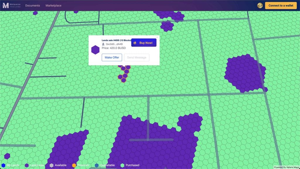 เราใช้พื้นที่บริเวณถนนเอกมัยถึงถนนทองหล่อ ในการสร้างที่ดินเสมือนออกมาจำนวน 89,000 แปลง โดยแต่ละแปลงขนาด 40 ตารางเมตร และแปลงเป็นรูปหกเหลี่ยม ในวันแรกของการซื้อขายกำหนดราคาขายที่แปลงละ 3 BUSD (~3 USD) หรือ 300 MVP และสามารถขายหมดได้ภายในเวลา 15 ชั่วโมง