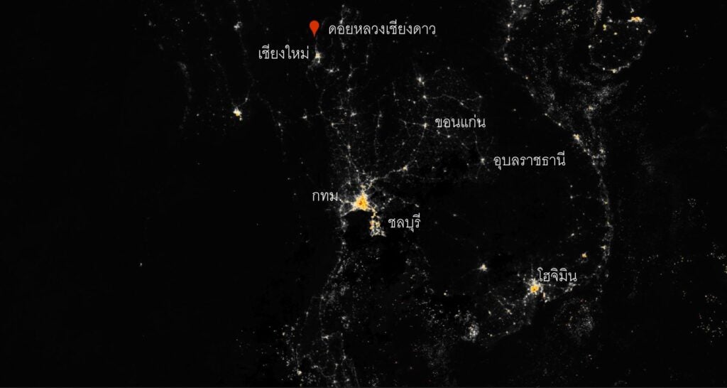 จากภาพจะเห็นได้ว่า มลภาวะทางแสงที่เกิดขึ้นก็จะอยู่ในบริเวณเมืองใหญ่ ๆ ทั้งสิ้น (กรุงเทพฯและปริมณฑล ชลบุรี เชียงใหม่ อุบลราชธานี ฯลฯ ของเพื่อนบ้านก็เช่น นครโฮจิมิน ประเทศเวียดนาม เป็นต้น) ดังนั้นสิ่งที่ง่ายที่สุดในการเพิ่มโอกาสในการตามล่าช้างก็คือ “หนีเมือง” ออกไปยังจุดสีดำในแผนที่นี้นะครับ