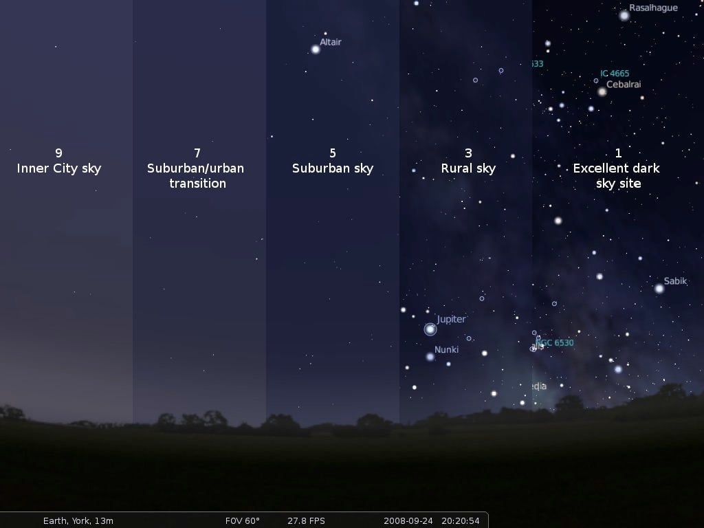 ในการหาคำตอบในเรื่องนี้เราก็ต้องทำการค้นหาสถานที่ท้องฟ้ามืดที่สุดหรือสถานที่ที่ไม่ถูกรบกวนจากมลภาวะทางแสง (Light pollution) หรือแสงที่เกิดจากกิจกรรมของมนุษย์ในเวลากลางคืนซึ่งจะส่งผลกระทบต่อการสังเกตุท้องฟ้ายาวค่ำคืน ดังแสดงในภาพที่ 1
