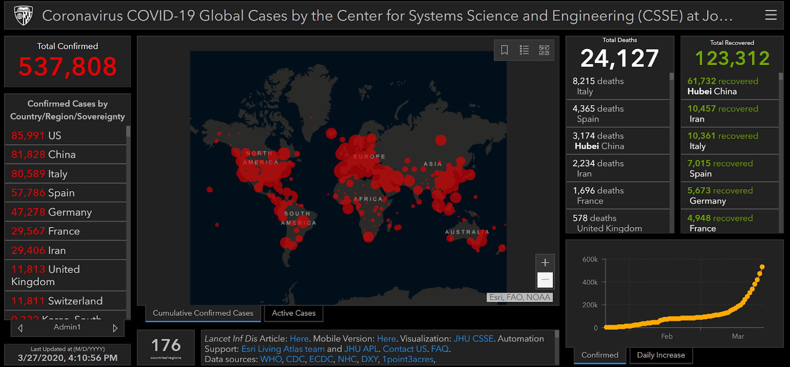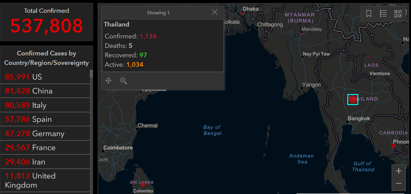 Online Dashboard นี้แสดงตัวเลขผู้ติดเชื้อและเสียชีวิตจาก “ไวรัสโคโรนา” แบบเรียลไทม์ และผู้ชมสามารถคลิกจุดสีแดงเพื่อดูรายละเอียดสถานที่ จำนวนผู้ติดเชื้อ เสียชีวิต และผู้ป่วยที่รักษาหายจากข้อมูลที่อัปเดตล่าสุด โดยมีวันที่และเวลาระบุไว้อีกด้วย ข้อมูลล่าสุดจากวันที่ 27 มี.ค. 2653 เวลา 16.50 น. มีจำนวนผู้ติดเชื้อจากทั่วโลกที่ได้รับการยืนยันแล้ว 537, 808 ราย เสียชีวิตแล้ว 24,127 ราย และได้รับการรักษาหายแล้ว 123,312 รายจากทั่วโลก