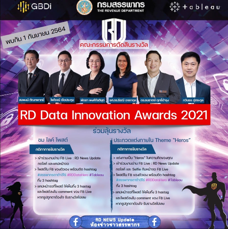 การแข่งขัน RD Data Innovation Awards 2021 ซึ่งนำโดยกรมสรรพากรร่วมมือกับ Tableau และสถาบันส่งเสริมการบริหารและวิเคราะห์ข้อมูลขนาดใหญ่ภาครัฐ (GBDi) เป็นการโครงการนำร่องในการพัฒนาบุคลากรของกรมสรรพากรที่กระจายอยู่ทั่วประเทศให้นำข้อมูลการจัดเก็บภาษีมาใช้แสดงผลบน Dashboards เพื่อเพิ่มประสิทธิภาพในการทำงาน และสอดคล้องกับยุทธศาสตร์ “D2RIVE” ดังที่กล่าวในข้างต้น