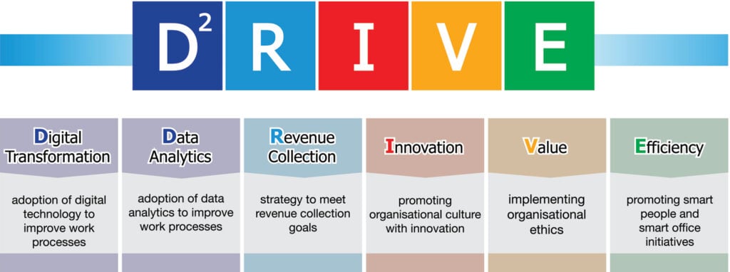 กรมสรรพากรมองว่าหน่วยงานนี้จะเป็นหน่วยงานจัดเก็บภาษีชั้นนำที่ขับเคลื่อนด้วยนวัตกรรมเทคโนโลยีดิจิทัลที่ทันสมัยและเหมาะสม และบุคลากรที่รู้รอบและเป็นเลิศทางด้านเทคโนโลยีดิจิทัล ซึ่งปัจจัยเหล่านี้จะช่วยสร้างเสถียรภาพทางการคลังและเสถียรภาพของการบริหารของรัฐ ซึ่งกรมสรรพากรได้กำหนดตัวชี้วัดจากวิสัยทัศน์ขององค์กรไว้ 3 ข้อ คือ การจัดเก็บและคาดการณ์เม็ดเงินภาษีได้แม่นยำมากขึ้น การส่งเสริมกิจกรรมเชิงพาณิชย์หรืออุตสาหกรรมโดยมาตรการทางภาษีได้อย่างตรงจุด และการเพิ่มประสิทธิภาพในการให้บริการประชาชนอย่างตรงใจ วิสัยทัศน์ดังกล่าวก่อให้เกิดยุทธศาสตร์เชิงรุกในนามว่า “D2RIVE” ซึ่งมาจากตัวอักษรย่อที่ประกอบไปด้วย Digital Transformation, Data Analytics, Revenue Collection, Innovation, Values, และ Efficiency