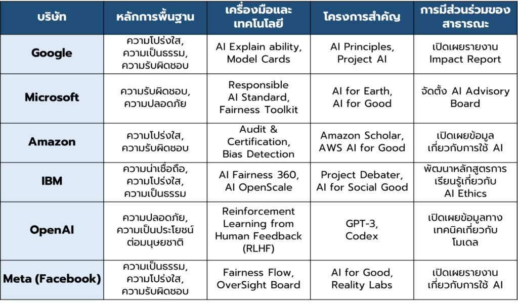 เพื่อให้เห็นภาพที่ชัดเจนขึ้นว่า Responsible AI ถูกนำไปปฏิบัติอย่างไรในโลกธุรกิจ เรามาดูการเปรียบเทียบแนวทางของบริษัทยักษ์ใหญ่ด้านเทคโนโลยี ได้แก่ Google, Microsoft, Amazon, IBM, OpenAI และ Facebook ดังตาราง