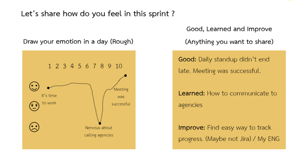 แผ่นที่แรกจะทำ emotion tracking บอกว่า Sprint ที่ผ่านมา ในแต่ละวันรู้สึกยังไง ดี, เฉย, แย่ ถ้าจำไม่ได้ก็เอาคร่าวๆ วาดเป็นกราฟออกมา ถ้าจุดไหนมีเรื่องจะเล่าก็จด ๆ ไว้ ส่วนอีกใบนั้นเขียน 3 อย่าง คือ