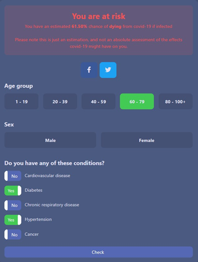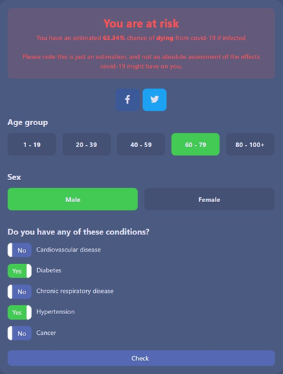 ตัวอย่างเช่น ชายอายุ 65 ปี ที่มีโรคประจำตัวคือ โรคเบาหวาน และโรคความดันโลหิตสูง ผลลัพธ์จากการคำนวณชี้ว่า ชายคนดังกล่าวมีความเสี่ยงในการเสียชีวิตหากเขาติดเชื้อ COVID-19 อยู่ที่ 63.34% ดังแสดงในภาพที่ 3
