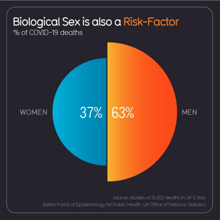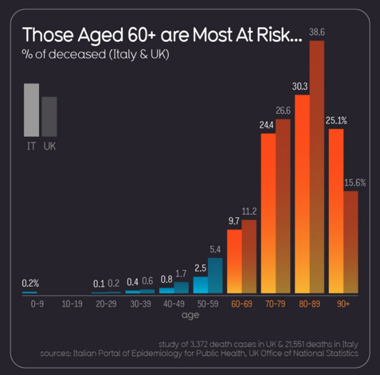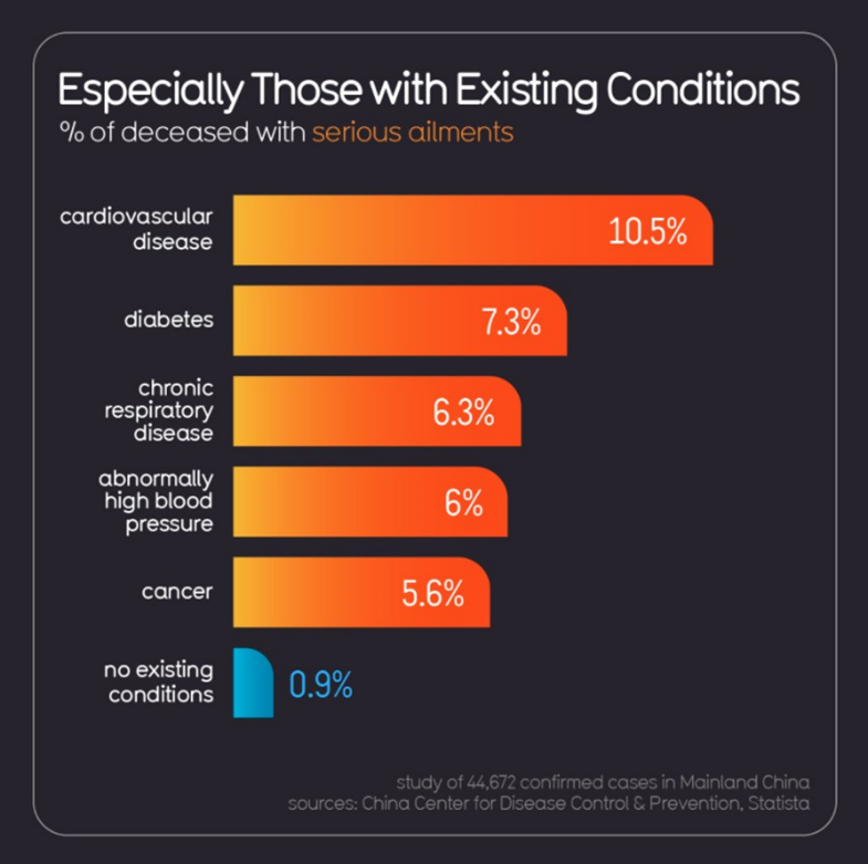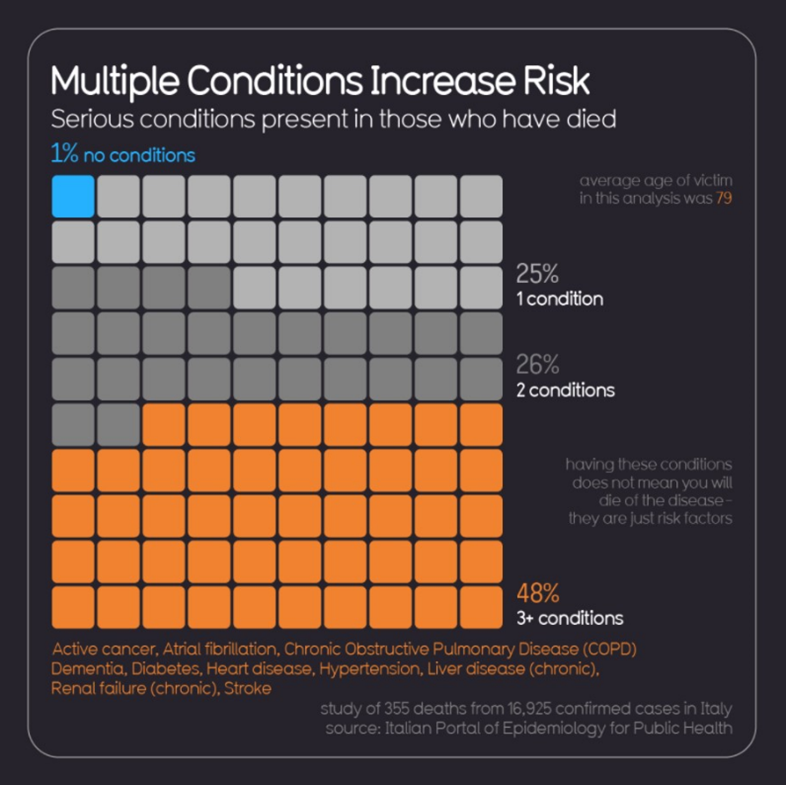 การวิเคราะห์อาศัยข้อมูลจาก COVID-19 #CoronaVirus Infographic Datapack — Information is Beautiful ซึ่งได้ทำการศึกษาวิจัยผู้ป่วยที่หายป่วยและเสียชีวิตจากโรค COVID-19 โดยจากการศึกษาพบว่า ผู้สูงอายุหรือผู้ที่มีอายุมากกว่า 60 ปี ถือเป็นกลุ่มที่มีความเสี่ยงสูง โดยเฉพาะช่วงอายุ 80-89 ปี และเพศชายมีความเสี่ยงมากกว่าเพศหญิงดังแสดงในภาพที่ 4 และภาพที่ 5 ตามลำดับ ภาพที่ 6 แสดงความเสี่ยงแยกตามโรคประจำตัวของผู้เสียชีวิต โดยผู้ที่มีความเสี่ยงในการเสียชีวิตมากที่สุดคือ ผู้ที่มีโรคหลอดเลือดหัวใจเป็นโรคประจำตัว รองลงมาคือโรคเบาหวาน โรคระบบทางเดินหายใจเรื้อรัง โรคความดันโลหิตสูง และโรคมะเร็งตามลำดับ หากผู้ป่วยรายใดมีโรคประจำตัวข้างต้นมากกว่า 1 โรค ความเสี่ยงในการเสียชีวิตก็จะเพิ่มมากยิ่งขึ้น โดยเฉพาะตั้งแต่ 3 โรคขึ้นไป จะมีความเสี่ยงสูงกว่า 50% ดังแสดงในภาพที่ 7 การมีโรคประจำตัวถือเป็นปัจจัยสำคัญ ตัวอย่างเช่น ผู้ที่มีอายุ 60 – 79 หากไม่โรคประจำตัวจะมีความเสี่ยงอยู่ 5% แต่หากผู้ติดเชื้อในช่วงอายุดังกล่าวมีโรคหลอดเลือดหัวใจเป็นโรคประจำตัว ความเสี่ยงจะมีสูงถึง 52.5%
