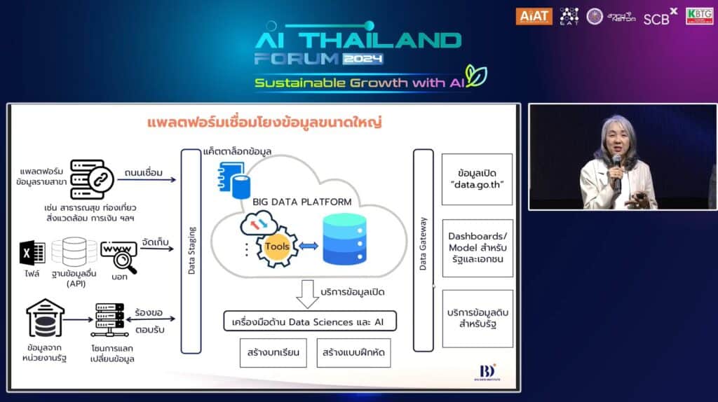สำหรับงาน AI Thailand Forum 2024 ในปีนี้จัดขึ้นภายใต้แนวคิด “Sustainable Growth with AI” ที่จะมุ่งเน้นการใช้ AI ในการขับเคลื่อนการเติบโตของประเทศอย่างยั่งยืน ซึ่งได้รวบรวมผู้เล่นหลักในตลาด AI ทั้งจากภาครัฐและเอกชน เป็นจุดเชื่อมโยงพลังของวงการ AI รวมถึงนักนวัตกรรมทั่วประเทศ เพื่อผลักดัน AI ให้เป็นเครื่องยนต์หลักในการสร้างเศรษฐกิจไทยในยุคใหม่ สู่การแลกเปลี่ยนวิสัยทัศน์สร้างกลยุทธ์ขับเคลื่อนเศรษฐกิจด้วย AI ซึ่งถือเป็นปัจจัยสำคัญที่จะผลักดันเศรษฐกิจของไทยให้เติบโตแบบก้าวกระโดดในอนาคต